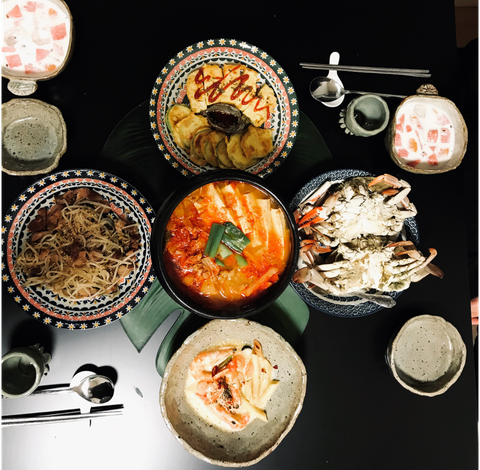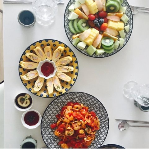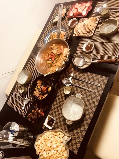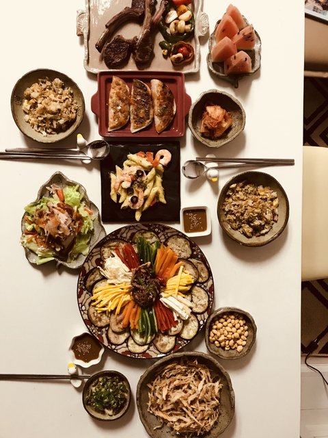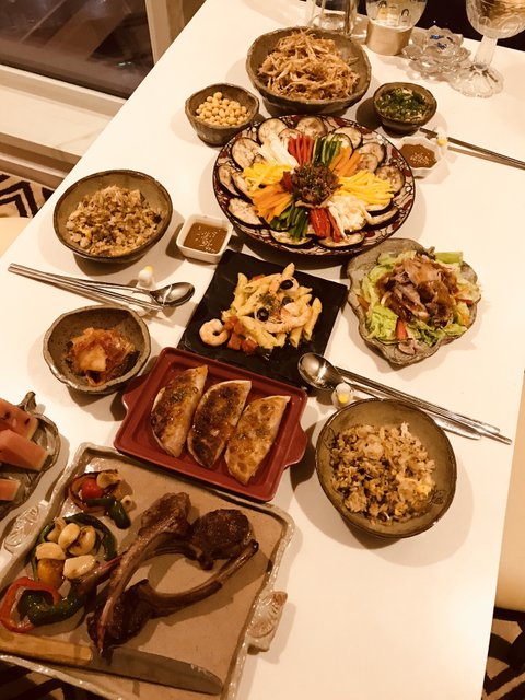 알탕,치즈스파게티,알밥,양갈비,군만두,과일 준비했어요 ~!