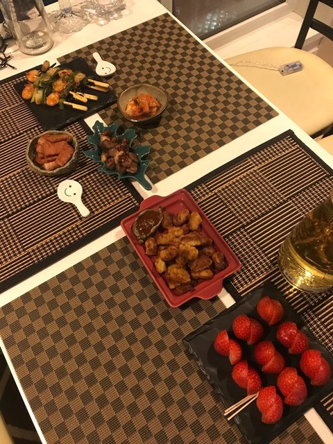 새우와관자 꼬치,양갈비,팝콘치킨 이날 밥을 안먹고 온 친구가