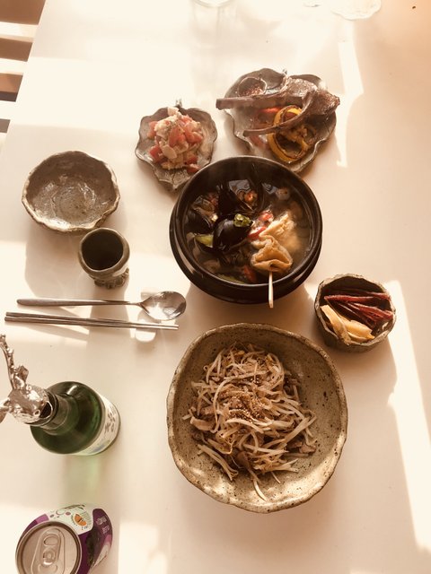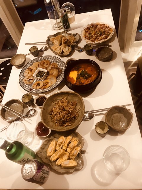 안주는 부대찌개와 계란말이 ,감자전,또띠아피자,삼겹숙주볶음,군만두 입니당~!