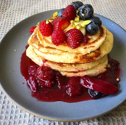 설탕에 절인 과일을 곁들인 펜케이크 입니다.