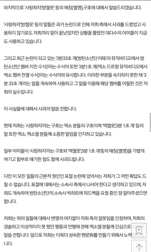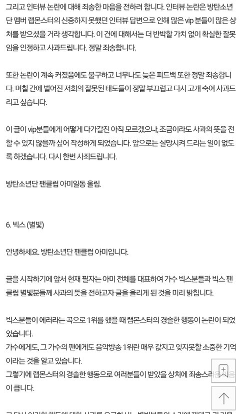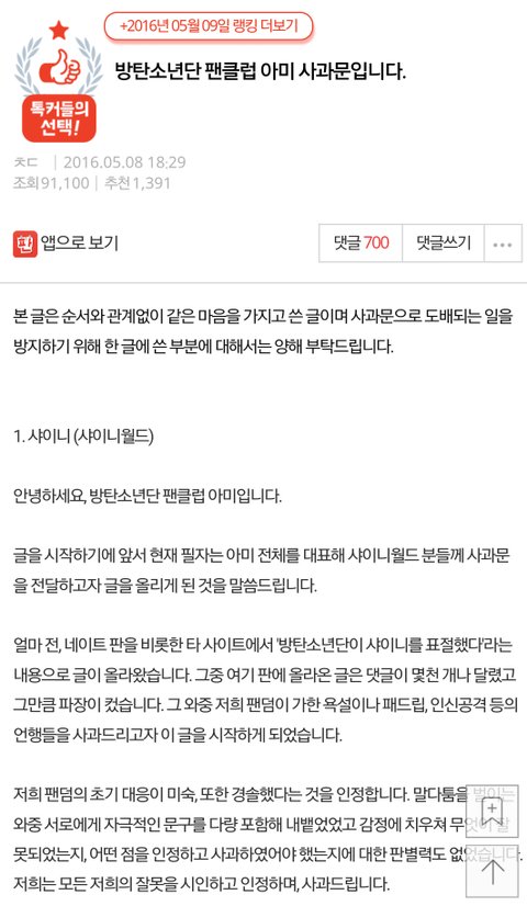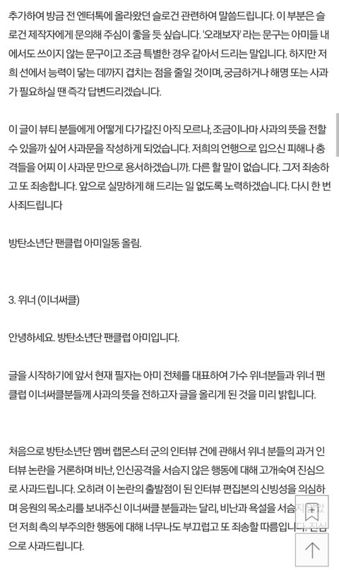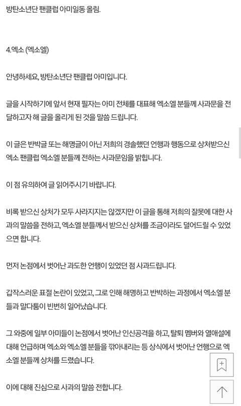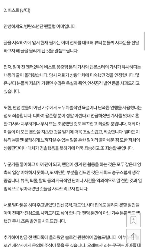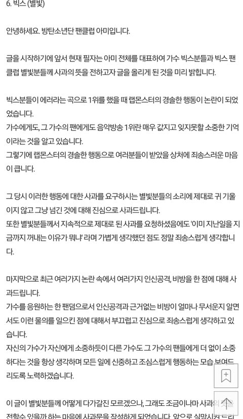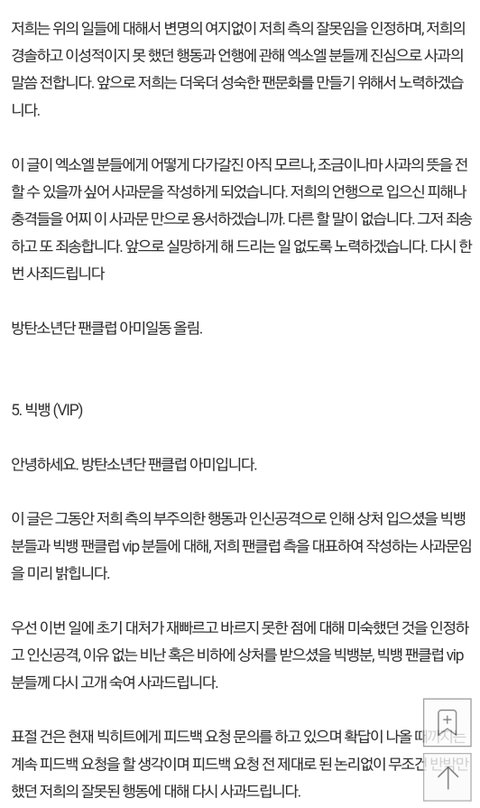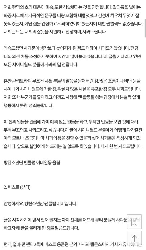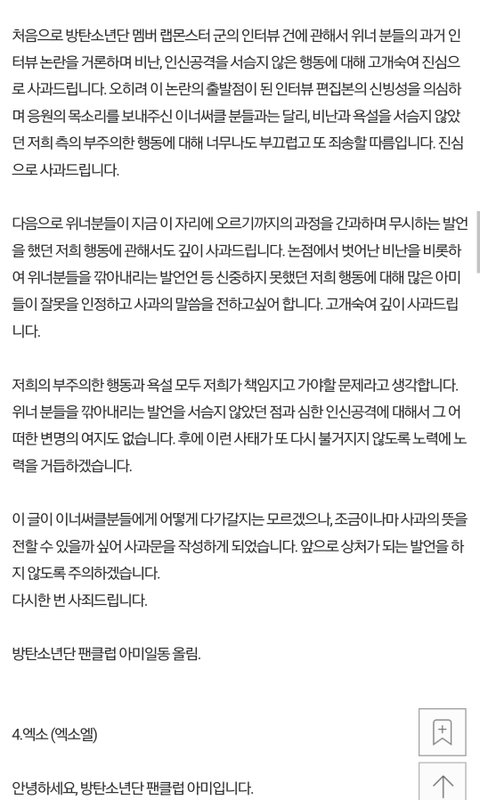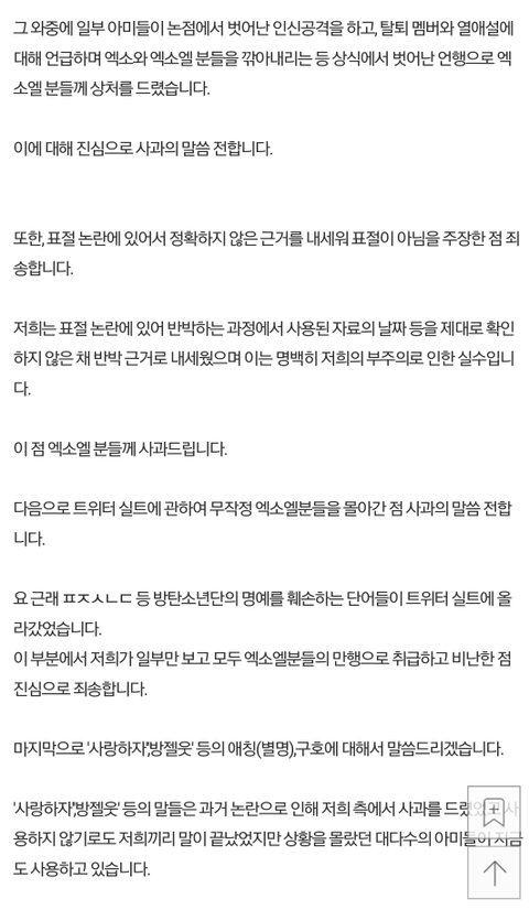 이 글 날짜보면 알겠지만 작년 5월에 쓴 글이었어 아미들 정말 눈물 쏟으면서도 사과했어 지금은 많은사람들이 아니라는 걸 알지만 그땐 알아주는 사람도 없었고 우리 팬덤이 한 과격한 말에 책임을 느끼고 아미들이 진심으로 쓴 사과문이니까 조롱같은건 하지 말아줘