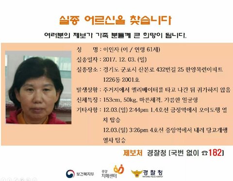 저희 둘째 이모가 지금 일요일에 집에서 나가신 뒤, 댁으로 돌아오지 않고 계십니다. 조기 치매가 있으셔서 성함과 집주소정도만 말씀하실 수 있는 정도이고, 일요일 오후 2:44분에 금정역에서 오이도행 열차를 타셨다고 합니다.