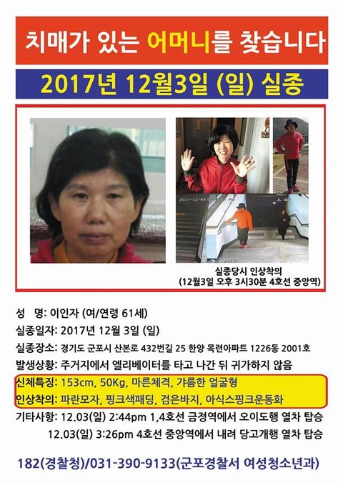 날씨도 계속 추워지는데 핸드폰도, 지갑도 아무것도 가지고 나가시지 않은 상황이라 연락도 할수 없는 상태입니다.. 혹시나 길가다, 노인정이나 복지센터, 치매요양병원이나 응급실 등등에서 보신분들은 계양경찰서나 군포경찰서 등 주변 경찰서에 연락해주시면 정말정말 감사하겠습니다..
