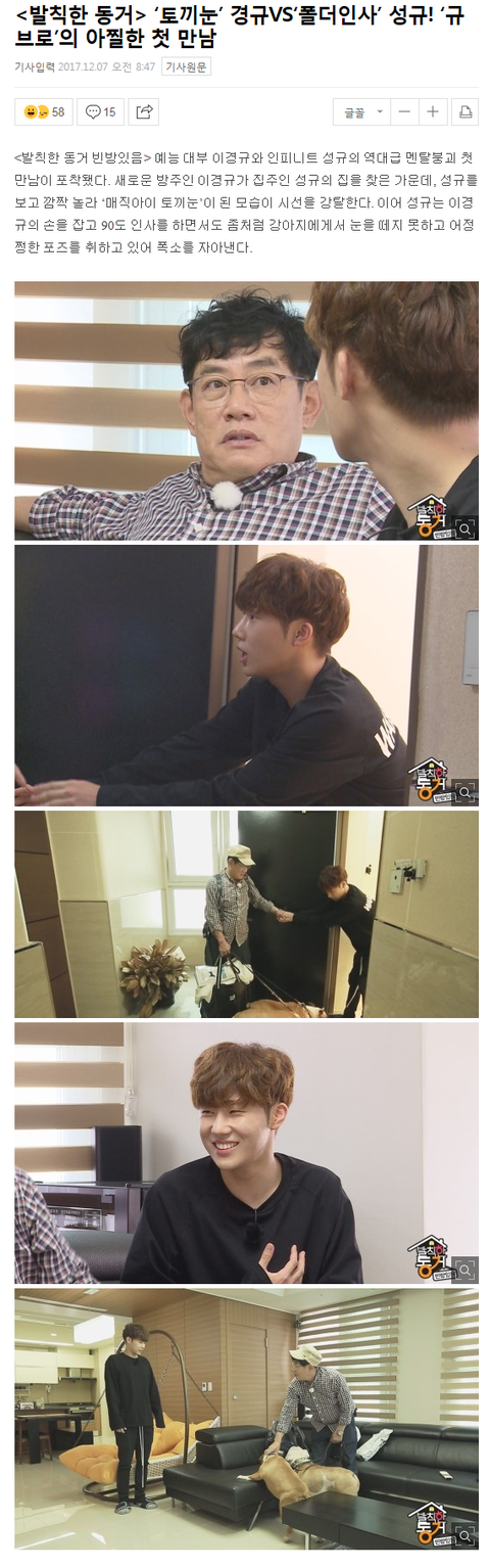 공개된 사진 속 이경규가 ‘토끼눈’을 하고 성규를 바라보는 모습이 공개되며 극도의 긴장감을 선사한다. 이어 성규가 현관 앞에서 이경규의 손을 잡고 90도 인사를 하면서도 자신을 향해 다가오는 강아지들의 등장에 멘붕 상태에 빠진 모습이 폭소를 자아낸다.
