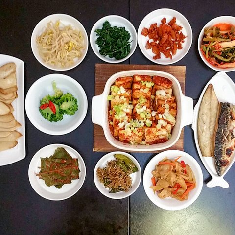 두부조림과 고등어가 메인인 반찬 한상. 남편과 저는 메인 요리 만 먹는 편이라 반찬을 잘 안해두는데 이때는 어르신들 방문으로 몇가지 해두었어요. 덕분에 저희도 잘 먹었구요.