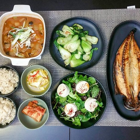 고등어 구이와 된장찌개. 연두부 샐러드와 청경채 볶움. 저희 집에 자주 올라오는 식단이에요. 고등어와 된장은 뗄래야 뗄 수 없는거 같아요