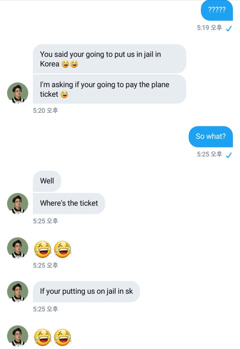 자기를 깜빵 보낸다고 했으니까 한국가는 티켓을 주래 ㅋㅋㅋㅋ 티켓이 어딨녜 ㅋㅋㅋㅋㅋㅋㅋ아 조카 얼타