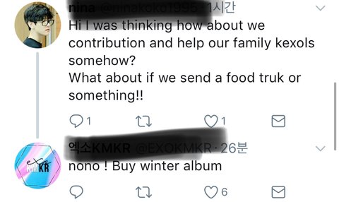 해외 팬들 우리 걱정 졸라게 하고 있음 지금 그래서 어떤 애가 해외 팬베한테 우리 푸드 트럭이나 그런 거 한국 팬한테 보내는 거 어떨까? 했더니 해외 팬베가 ㄴㄴ 겨울 앨범 사 이럼 ㅌㅋㅋㅋㅋㅋㅋㅋ