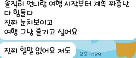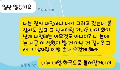 마실물도 없고 어메니티도 없는 그 호텔에서 아침을 먹었냐는 카톡이 정말 기가차서 답장하기도 싫더라고요 그래서 오늘 나는 따로 다닐테니 너는 그 애랑 둘이 놀으라고 카톡을 보냈더니