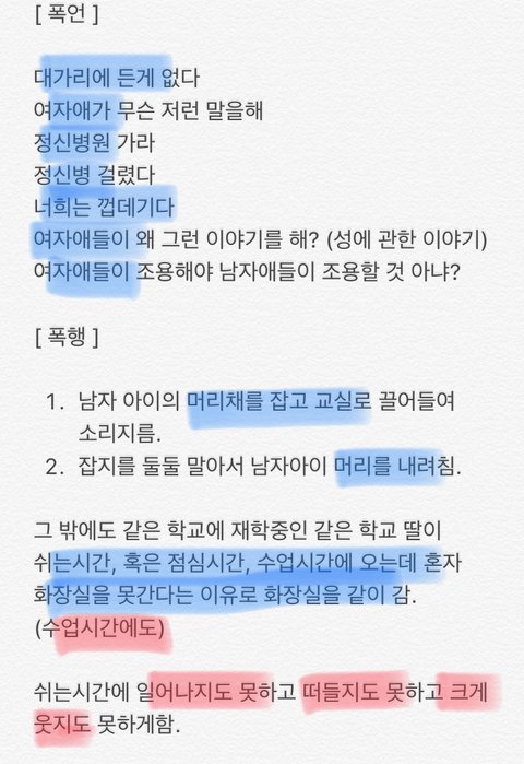 제발 저희를 도와주세요 이러한 문제들을 부모님께 말씀해도 별일 아닌 것 처럼 넘어가십니다. 저는 행복한 일년을 선생님과는 전혀 느끼지 못했습니다.