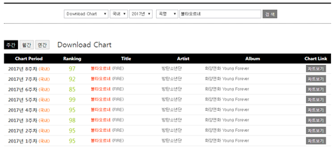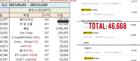 해당표는 '종합 차트'가 아닌 '국내 차트'를 기준으로 작성한 표이기 때문에 국내 차트 기준 불타오르네는 2017년 8주 차트인 총 '145,594' 다운을 누적한게 맞습니다. 역시 엑소와 방탄 모두 공평히 '국내 차트' 기준이기 때문에 누구에게나 공평한 기준입니다.