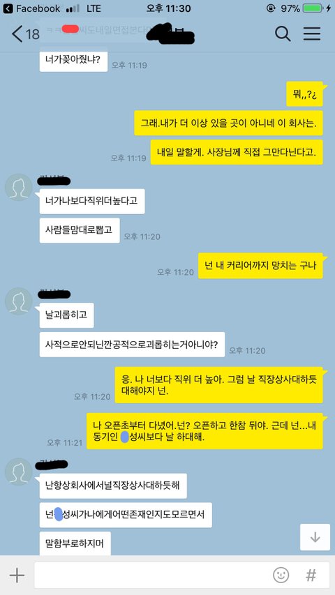 카톡내용에 제가 자기를 괴롭혔다는건 당최 무슨 소린지 모르겠습니다. 전 공과사를 구분해야한다고 생각하기때문에 혼낼 것은 혼내고 다시 해야할 것이나 뭐..그런 것들 때문에 서운하다고 몇번 말하긴 했지만 참,, 맹세코 뭐 괴롭힌 적 없고 다 피해의식입니다. 사랑하는 사람을 왜 괴롭히겠습니까??상식적으로.