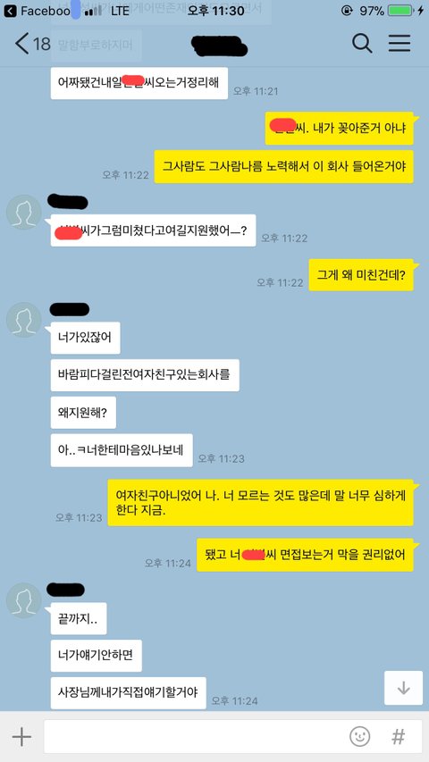 일단 저는 29살 여자 회사원이구요. 이제 오픈 한 지 3년정도 된 회사에서 운좋게 일하고 있습니다. 오픈때부터 일했기때문에 저에겐 더 애착있는 회사구요. 카톡 상대방이자 제 남자친구는 30살이지만 저보다 늦게 들어와 저를 상사로 대합니다. 그리고 남자친구는 그런 점에 약간 피해의식??을 느끼는 듯 하구요..그런데 문제는 제 예전 짝사랑남때문에 벌어졌습니다. 1년전쯤 좋아한 남자가 있는데 그 남자가 월요일날 (카톡으로는 내일 면접본다고 써져있지만 둘다 착각했습니다.내일이 아니라 월요일면접입니다.) 면접을 보러오는 것 부터 시작되었습니다. 남자친구는 제가 그 사람을 좋아했던 걸 알기때문에 더 싫어하구요,,사실 짝사랑 남과는 이미 끝난지 오래입니다. 하.. 그런데 오빠는 제가 그 사람을 꽂아줬다고 생각합니다. 저 그정도로 영향력있는 사람두 아니고 그 사람과 일절 연락도, 그사람이 지원하는 것도 오늘알았습니다. 싸우던 도중에 너가 꽂아줬냐,, 그런 말 들으니 저도모르게 그만둔다고 말해버렸습니다.. 저런 거로 충분히 꼬투리 잡을 사람이구요. 지금 쓰다보니 왜 지금까지 사겼는지 모르겠습니다..