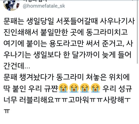 ㅠㅠㅠ한달동안 잘 보관해놨다가 예쁘게 붙였네ㅠㅠㅠ 편지나 쪽지같은거 다 읽나봐 적어주기만했다는데 소즁히 잘 보관해놓은거보면..ㅠㅠㅠㅠ성규너무착해ㅠㅠ