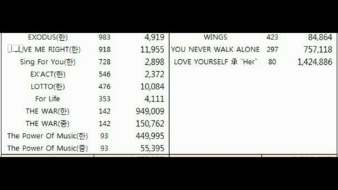 지금 저쪽 앨범 war랑 power 한국꺼 합치면은 130만장이고 우리는 140만장으로 우리가 더많잖아 근데 저쪽은 중국앨범 포함으로 160만장이라면서 자기들이 점수가더 많다 하는데 우리 이번 일본앨범 30만장은 포함 안되는거야? 그냥 궁금해서..... 분란조장같은거면 지울게ㅠ