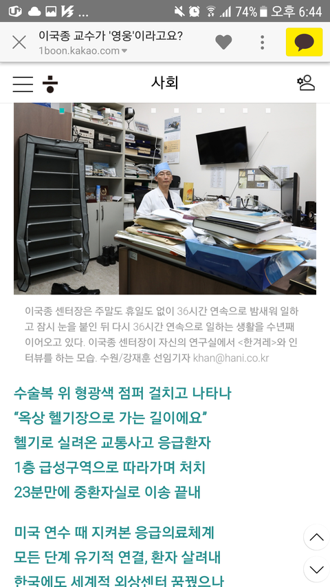 이걸 보고 좀 많이 충격을 받았어.. 일단 외상센터라는 명칭에 대해 전혀 모르고 있었기도 하고 .. 이런 의사분이 존재한다고? 하는 경외감이랄까? 그런 복잡 미묘한 감정을 느끼다가 홀리듯 교수님에 대한 인터뷰 내용, 뉴스기사등을 다 찾아보고 멍~해졌지..
