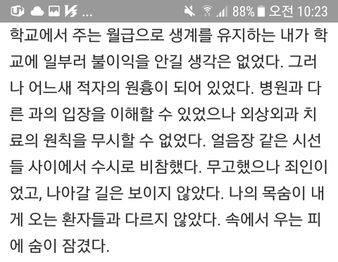 다행히 최선을 다해 치료를 했다고 법원이 중재해 버스회사가 병원비를 갚도록 하는 화의(和議)가 선언됐다. 대신 의료 감염에 쓴 항생제 비용 250만원을 내라는 명령이 나와 사비로 냈다. 환자 상태가 좋지 않아 감염을 막느라 항생제를 썼을 뿐이었다. 그래도 이쯤해서 끝난 것이 고마웠다. 250만원이 큰 부담은 아니었다. 환자 상태가 좋지 않았는데 도망칠 정도로 살아줘서 괜찮다고 생각했다.