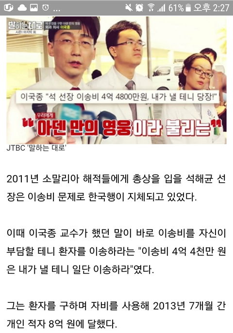 2011 년, 이때 석선장님을 에어앰뷸런스로 한국까지 이송하는 비용이 4억 4천이였대요., 근데 그걸 외교부가 미적대자 교수님이 너무 답답해서 자기가 내겠다고 하심.. "나중에 정부가 줬겠지..?" 아뇨 . 비용은 한진해운이 가입한 선박회사에서 처리해줬는데.. 그 과정에서 교수님은 수차례 스위스 에어앰뷸런스 회사로 부터 빚 독촉을 받았다고 해요.. 너무 힘들어하셨다고 동료의사분이 인터뷰하셨어요.