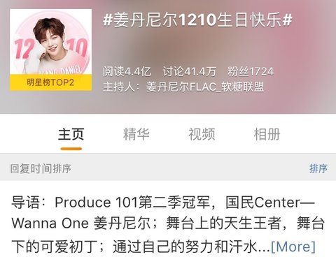 중국 웨이보 #강다니엘1210생일축하해 태그 스타부분 2위