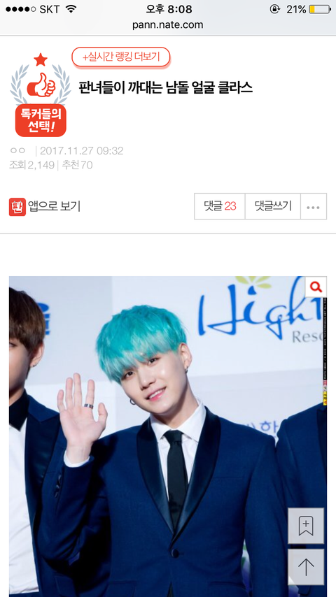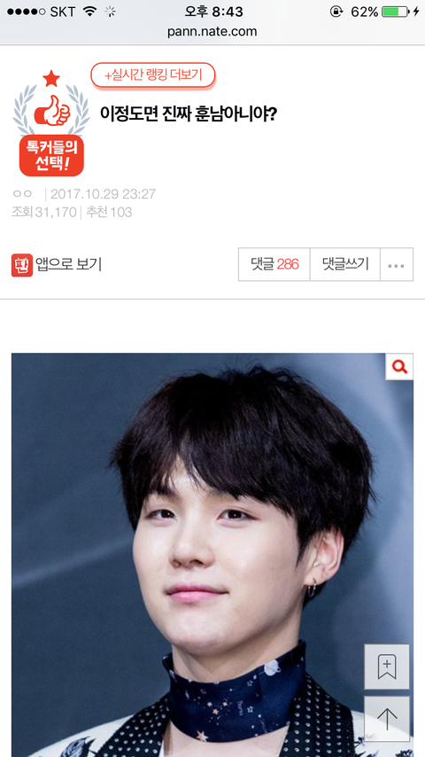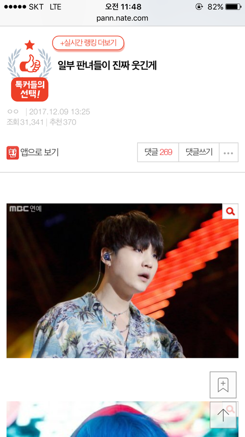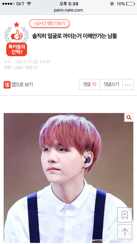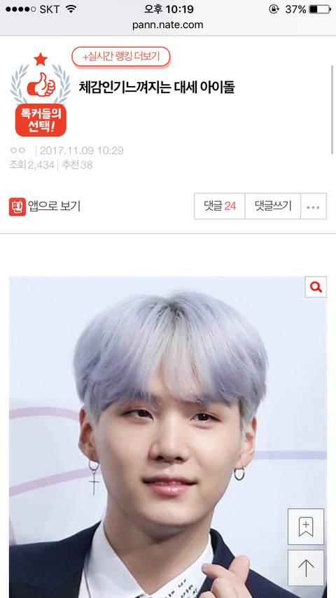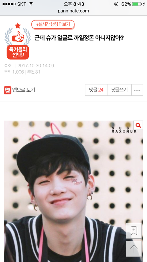 잊혀질 때쯤에 슈가 외모 칭찬하는 척 하면서 돌려까기 유도하는 글 주기적으로 엔터에 올라오는 거 알지? 지금도 톡선에 올라가있고