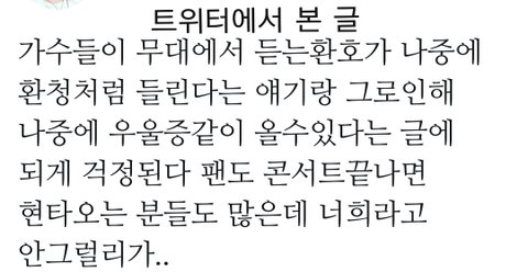 근데 그 다음날 그니까 12월 9일부터 내가 지금 이거 쓰는 시간동안 진짜 이유없이 너무 괴롭고 힘들어서 쓰는글이야 솔직히 너무 힘들어 12월 9일 아침에 가족들이랑 목욕탕갔다가 나는 빨리 씻고 가족 기다리는데 환청이 들리면서 ( 우와아아아아아아ㅏ아!! 하는 함성소리) 갑자기 뭔가 혼자있는거같고 공허하고 외로워지는거야 난 진짜 그때 너무 놀라서 벌떡 일어난거같아 환청이 진짜 너무 컸거든 목욕탕안에 있던 사람들이 내 귀에대고 소리지르는줄알았어 진짜 너무 놀랬어 근데 그때부터 자꾸 지금까지도 몸에 힘이 쫙 빠지고 머리도 계속아프고 그리고 또 현타오더라 그때 당시에 몇만명의 아미들과 아미밤을 보고 진짜 이쁘다 ... 최고네 라는 생각밖에 안들었는데 어제부터 갑자기 내가 그 몇만명중에 하나라는 생각부터하니 우울하고 방탄은 나 모르는데 이게 뭐하는거지 .. 또 방탄이랑 내가 진짜 좀 멀리 떨어진거같고 우리와 전혀 다른세상에서 사는 사람들 같았어 그리고 이게 현실이구나 .. 라는 생각도 진짜 많이들었어 맞는 말일수도 있지만 갑자기 뜬끔없이 이런 생각이 가득한거야 그래서 트위터나 네이버 그런곳에다가 많이 검색해봤는데 그런 사람이 많다더라고 (밑에 사진은 내가 검색해보고 너무 공감해서 올리는 거야 문제가 된다면 바로 지울께)난 나만 그러는줄알았어 미친줄알았거든 그래서 그럭저럭 자기합리화하고 있었어 근데 트위터를 보면 중콘 후기 첫콘 후기 이러면서 영상 방탄 멘트 그런거 진짜 많이 올라오잖아 난 근데 이상한게 진짜 한번갔다온것도 감사하다고 해야하는데 욕심이 많아진건지 중콘이랑 막콘을 안간게 그렇게 후회가 되더라고 조금 후회하면 모를까 하루종일 우울하더라 못간게 그렇게 진짜 심했어 잊어야지 하루갔다왔으면 됐잖아라는 생각을 해도 안간 나한테 한심한 생각이 가득했어 진짜 나 왜이러지 진짜 그래서 나 아직까지도 너무 우울해 내가 이상한거야 ? 환청들리고 진짜 우울증이라도 온사람처럼 하루종일 축 .. 기운없고 나도 진짜 너무 힘들더라 내 자신도 내가 왜 이러는지 모르겠고 여운이 남아도 너무 많이 남은거같아 인생 첫 콘서트라 그런지는 모르겠지만 힘들더라 이럴줄알았으면 안가는게 나아 라는 생각도 들었고 진짜 우울증 온거같아 되게 힘들어 빨리 여운이 사라졌으면해 혹시 예전이나 이번에 콘서트 갔다오고 여운이 너무 안가셔서 힘들었다거나 나처럼 우울한 아미들 있니 ..ㅠㅠ ?? 조언좀 부탁해 힘들다너무.