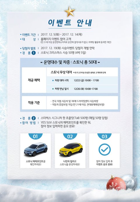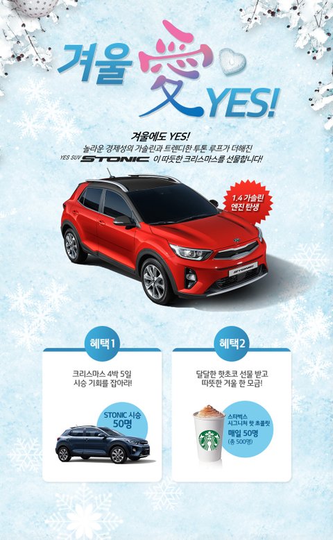 1. 크리스마스 4박 5일 스토닉 시승 (50명) - 추후 발표2. 스타벅스 시그니처 핫 초콜릿 (매일 50명, 총 500명) - 즉석 당첨