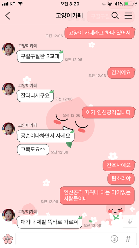 그런데 이 고양이 카페 여 사장이 유독 아이에게만 불친절합니다 아이가 고양이를 괴롭히는것도 아니고 뛰어다니는것도 아니고 단지 저한테 와서 엄마 이고양이가 이랬어 저랬어 말하는 목소리 데시벨이 좀 높았다고 생각됩니다~ 그런데 네번 방문 동안 단 한번도 지적 받은 적이 없었고 아이도 억지로 고양이를 안으려 하지도 않았어요 그런데 9살난 아이가 질문이 좀 많긴 했어요~ 왜 이 고양이는 케이지 안에 있나요? 왜 전에는 고양이 놀아주는 기구가 있었는데 없어졌나요? 왜 이 고양이는 위에서 안내려오나요? 그런데 다른 고객이 질문했을때는 웃으며 친절하게 얘기해주는데 유독 아이에게만 퉁명하고 불친절했어요 네번째 방문이었기에 다녀와서 사장님께 카톡을 남겼죠 9살 남자아이라고 색안경 쓰고 보시지 말고 아이 동심에 좀더 친절하게 답해주셨으면 좋겠다는 내용으로요~ 그런데 돌아온 답변은 니 아들이 일도 못하게 질문을 퍼붓더라 그러면 조용히 시켜야는거 아니냐 조용히 해야하는데 시끄럽게 하더라 엄마가 주의를 줬어야는거 아니냐 내 고양이들이 위험했다 라고 말하는거예요 왜 그럼 그자리에서는 지적을 안하고 아이 질문에만 퉁명하게 답한건가 진짜 의아해서 난 보고 있었고 그 정도로 위험한 상황은 아니었지 않냐고 얘기했는데 어느새 그 여사장 남편이 가로채 막말을 하기 시작했어요~