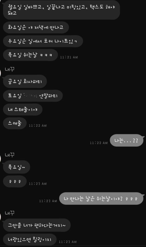 저랑 있을땐 일, 친구 연락도 자주하고 핸드폰게임도 하고 그냥 혼자 있는 시간에 제가 낑겨있는거 같아요
