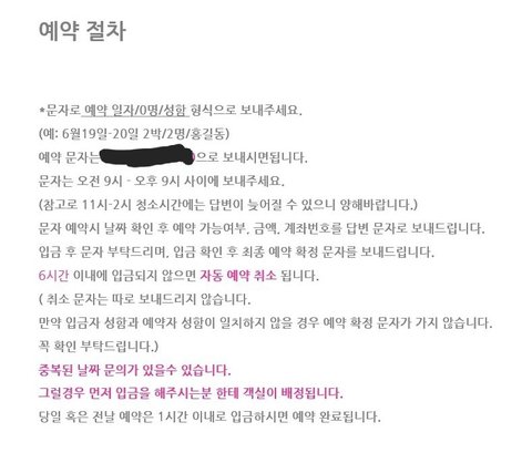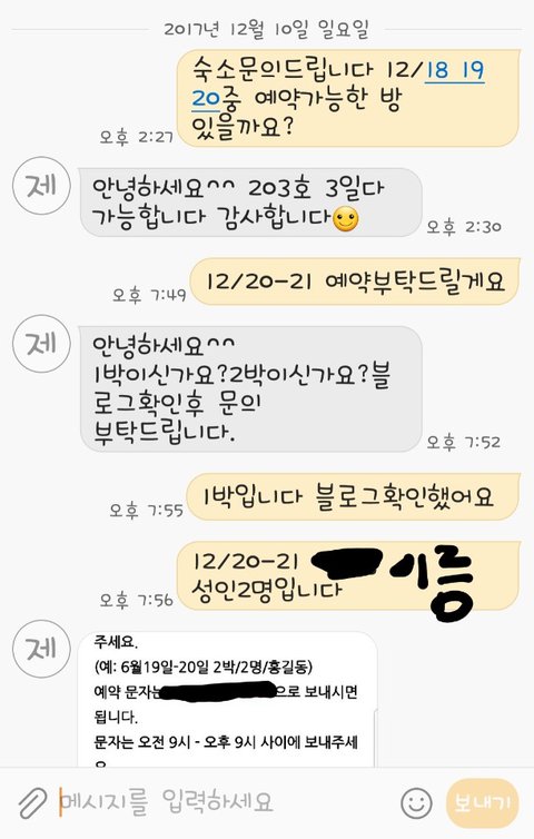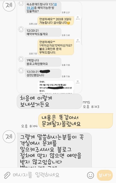 결론적으로 업체쪽은 블로그에 기재된 예) 날짜/박수/인원/이름 양식으로 예약문의 하지 않았다는 이유로 일면식도 없는 사람을 객실에서 문제나 일으키는 사람으로 취급하였고, 이 또한 블로그 확인을 제대로 안했다는 식으로 돌려말을 했습니다.