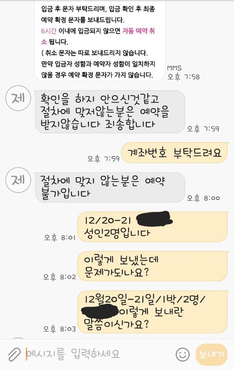 제주도는 대부분 문자로 예약을 받더라구요. 날짜가 얼마 남지않아 생각했던 숙소마다 문자로 확인을 하고있었는데, 그 중 한 업체에서 발생한 일입니다.