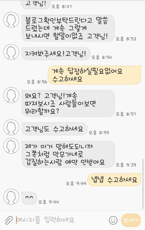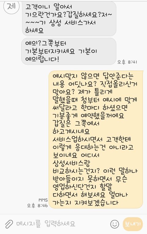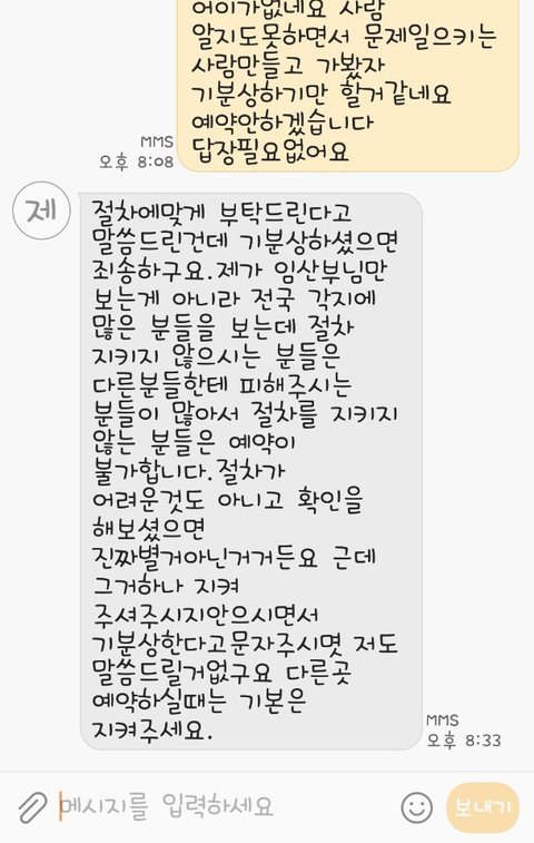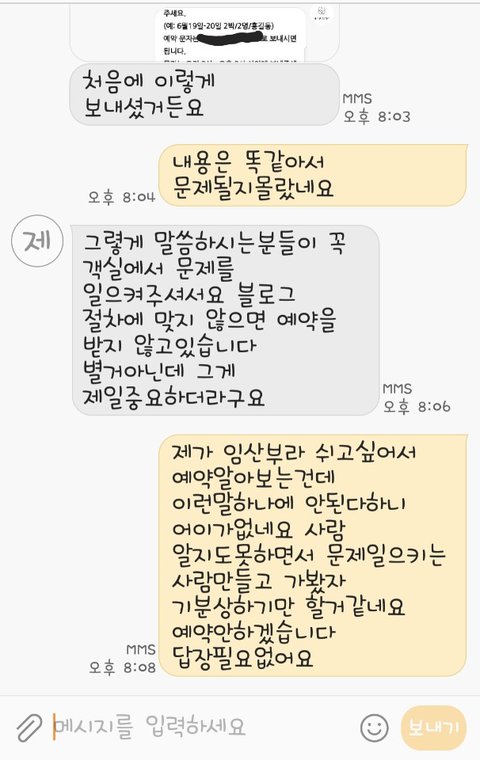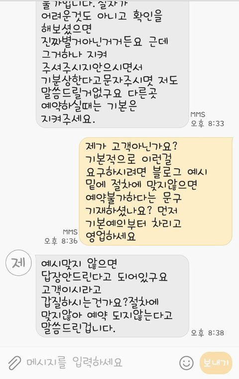 블로그 예약절차 보시면 아시겠지만, 처음부터 예시대로 작성해달라고 하던지, 블로그에 예시대로 문자발송해주셔야 예약된다던지 그런 기본적인 문구도 없고, 예시 맞지않으면 답장안준다는 내용이 대체 어딨는지 본인들이 뭐라고 써놓은지도 모르면서 제가 갑질한다고 말꼬투리만 잡고있네요.