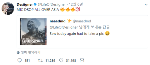 여튼 요새 디자이너가 MIC Drop 잘돼서 엄청 신나함!!얼마전에 아미가 디자이너한테 한국 포스터 찍은 사진 보내줬는데 ㅋㅋ디자이너 바로 자기 트윗에 올림