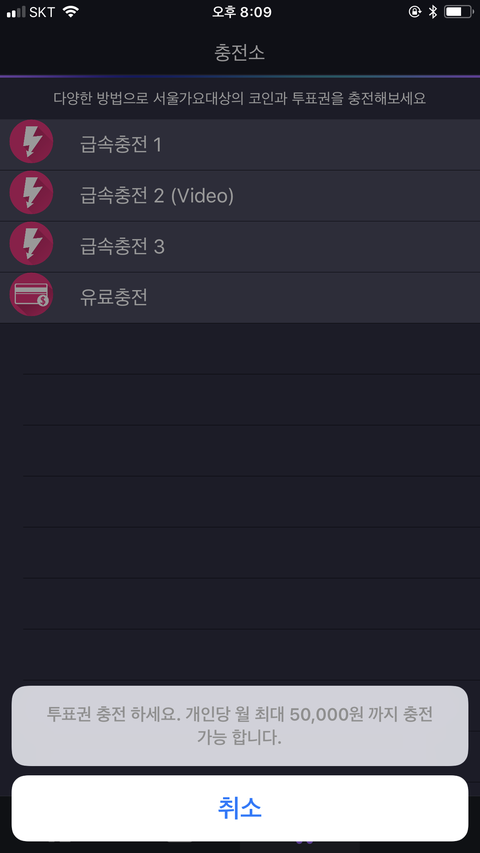 ㅅㄱㄷ 투표하는데 코인받을여면 급속충전앱만 다운 받아야 하는 거야? 유료충전은 안되나? 유료충전 누르면 자꾸 이런 화면만 나오는데ㅜ나만그럼??