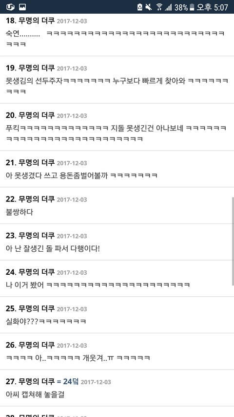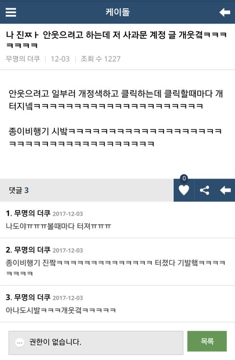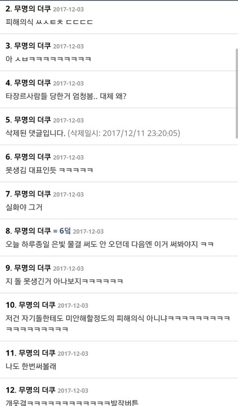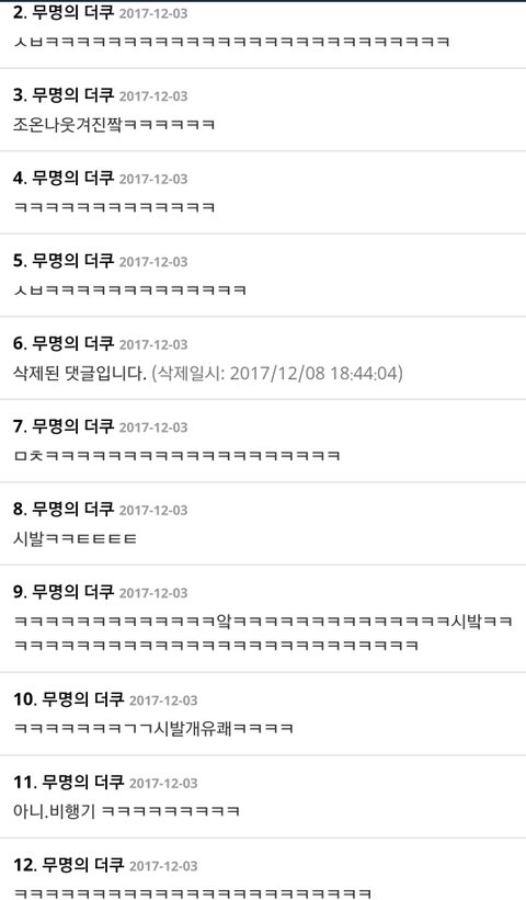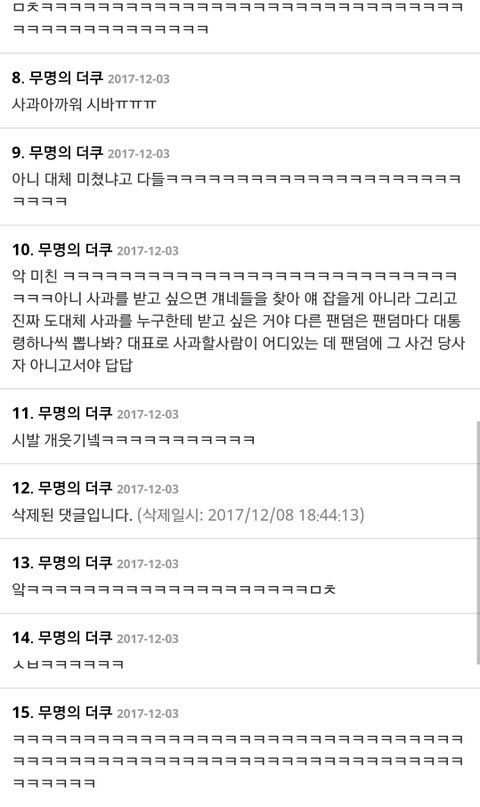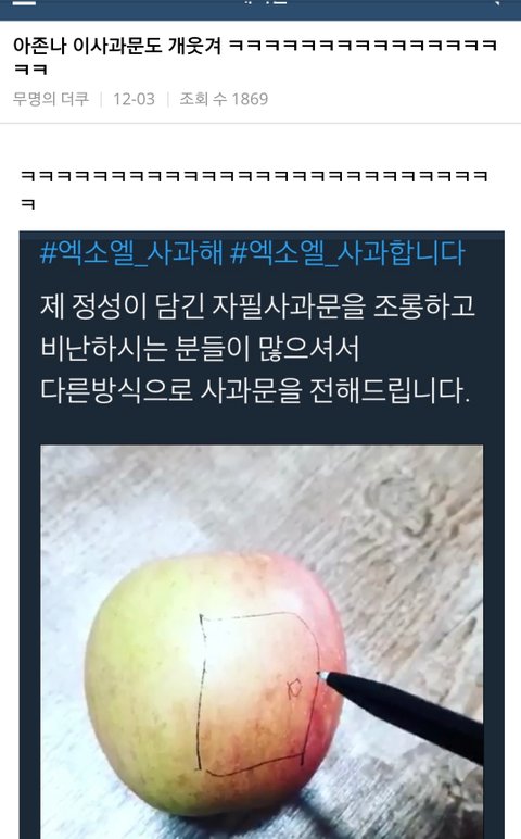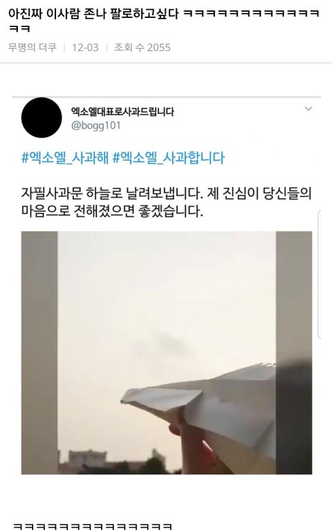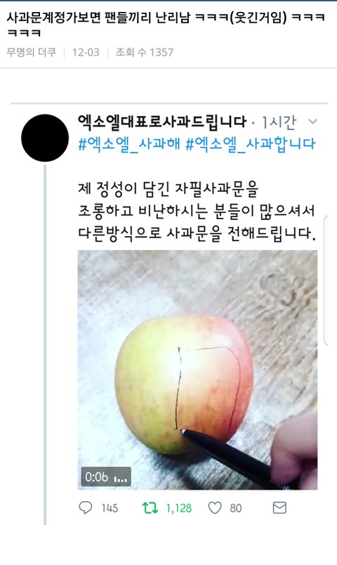 저것뿐인줄 알음? 오히려 지들한테 사과하라고 실트올림ㅋㅋ아주 그냥 4단으로 정치질을 하더라ㅋㅋㅋㅋㅋㅋ엑소엘이 그랬다는 증거있냐- 이때다싶어 너무 심하다- 엑소가 보면 어쩔거냐- 엑소엘한테 사과해라ㅋㅋㅋ저러는 와중에 워너원과 상처받은 팬들한테 죄송하다,미안하다는 실트는 한개라도 올릴 생각 단 하나도! 못하고 소수타령만 오지게 하지; 니들말대로 소수라쳐도 다수가 사과는 안하고 저런 실트나 올리고 있는데 소수드립 계속 하는게 말이나 됨? 어이가 없음
