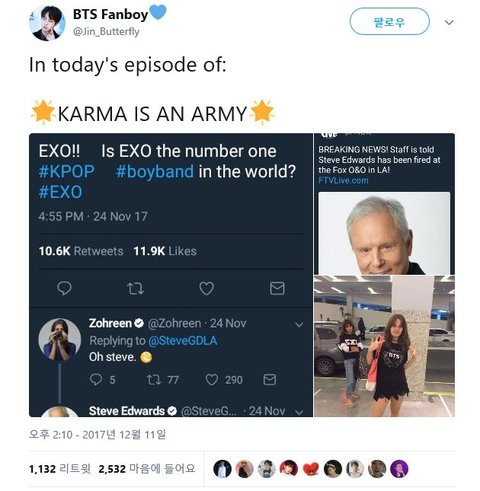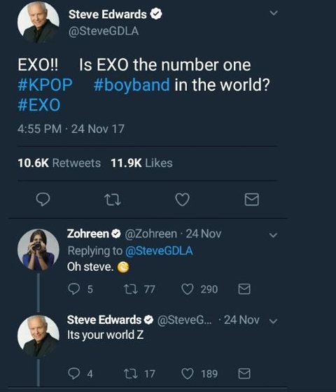 미국 폭스티비의 스티브 에드워드라는 앵커는 엑소를 엄청 좋아해서 본인 트위터에 언급도 많이 하고 팬들하고 대화도 나누고 노래도 추천 받고 그랬음.