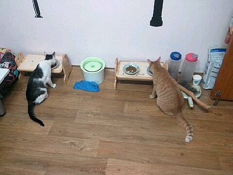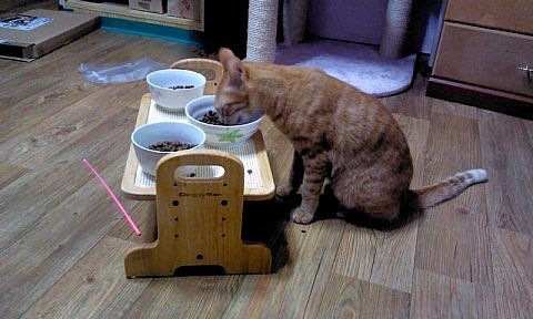 2014년 조로의 중성화 수술 후 합사한 후에 찍었어요. 키이와 로이의 사료 도둑질 방지를 위해서 나무로 식탁을 만들어서 설치해놨어요. 그들이 기술을 사용할 때의 각도가 안 나오게끔 이요.