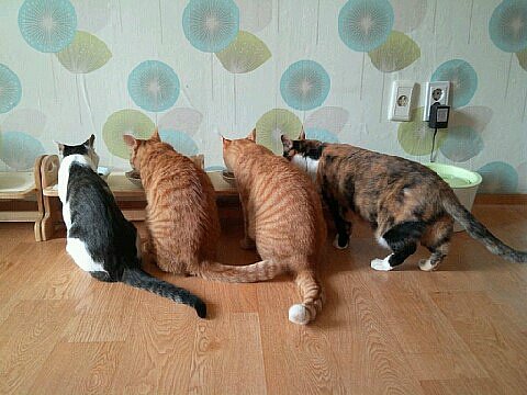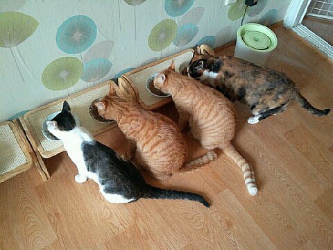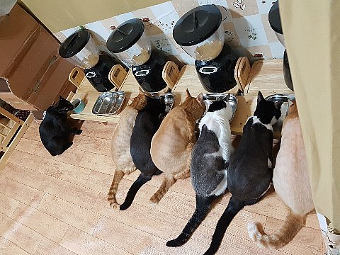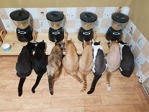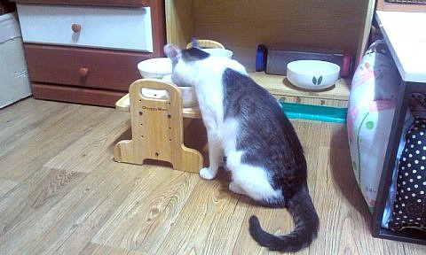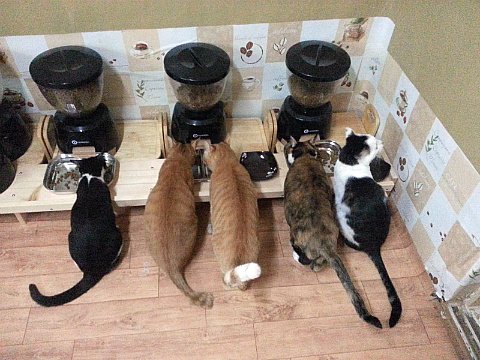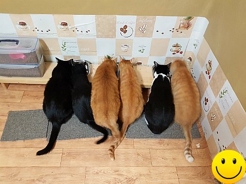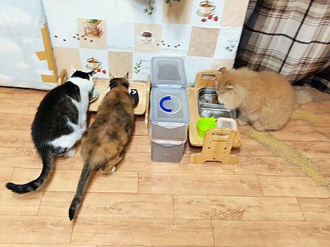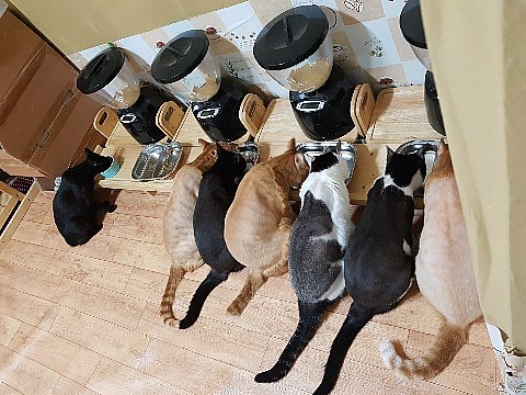 평소에 제가 수시로 챙겨주고 있어요. 집에서 유일하게 어린 고양이만이 식사시간이 아닐 때에도 밥을 먹을 수 있어요. 특권이에요.