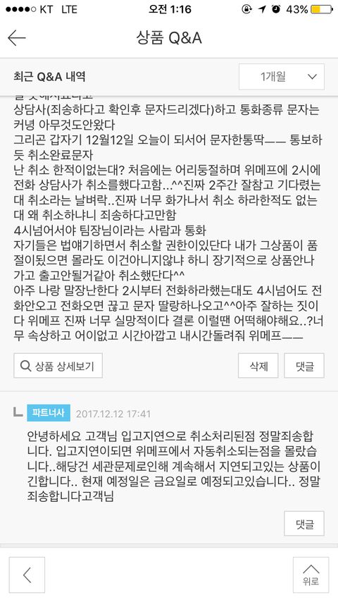 자기들은 법얘기하면서 (전자거래법상)취소할 권한이있다고 계속그러더라고요 그래서 제가 그상품이 품절이됬으면 몰라도 상품도 있는 상태에서 안내도 없이 취소라는건 아니지 않냐 하니 장기적으로 상품안나가고 출고안될거같아 취소를 했다고 합니다 또 법얘기를하면서요.