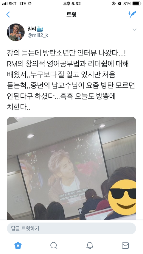 헐 소오오름 우리학교애서도 오늘 방탄을 주제로 발표해서 저 영상봤는데..!!우리교수님은 태태 영어 좀더공부해야할거같다고하심 ㅜ