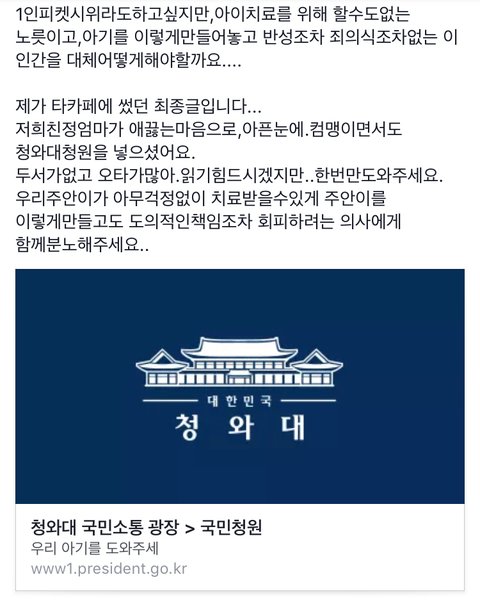 http://www1.president.go.kr/petitions/64424?page=3 주안이를위해,의료사고로 피해본 모든이들을 위해 서명한표 제발부탁드립니다.