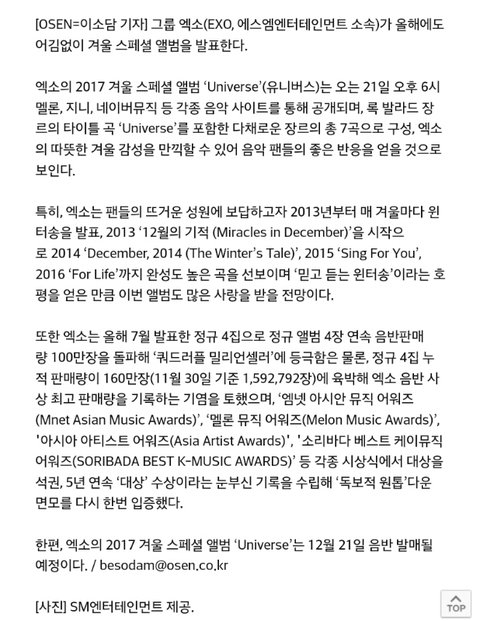 [공식입장] 엑소, 겨울 앨범 21일 컴백..타이틀곡은 '유니버스' (출처 : OSEN | 네이버 TV연예)t.co/qzKd8TFCYd