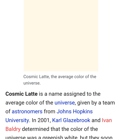 대충 해석하자면 홉1킨스 대학의 어느 연구학자들이 붙인 우주의 평균적인 색이래 2001년에 학자들이 우주가 초록빛으로 변한다는 조사결과를 내놓았는데 2002년에 이 조사를 수정했고 초록빛이 아니라 뭔 백포도주(?)색으로 변했다고 함 그게 지금의 코즈믹라떼라는 색깔이됨
