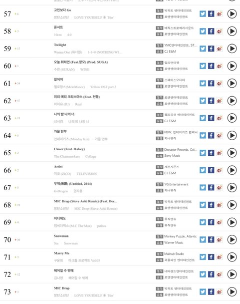 전주에는 봄날과 고민보다go 두곡이 상위 2곡이라(집계기간에 가온차트에 순위가 역전되었다고함) micdrop이 집계가 안되었다고 합니다.