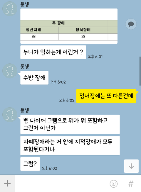 안녕하세요 28살 소아정신과에서 근무 중인 치료사입니다. 동생은 26살 의료기 회사에서 근무하고 있습니다.