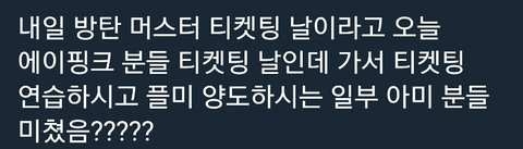 이는 일부 아미들이 지들 콘서트 연습한다고 에이핑크 콘서트 와서 예매한건데 여기서 약간 짜증이 남 근데 연습경우는 허다 하니까 이해함 근데 ㅋㅋㅋㅋㅋㅋㅋ