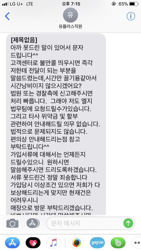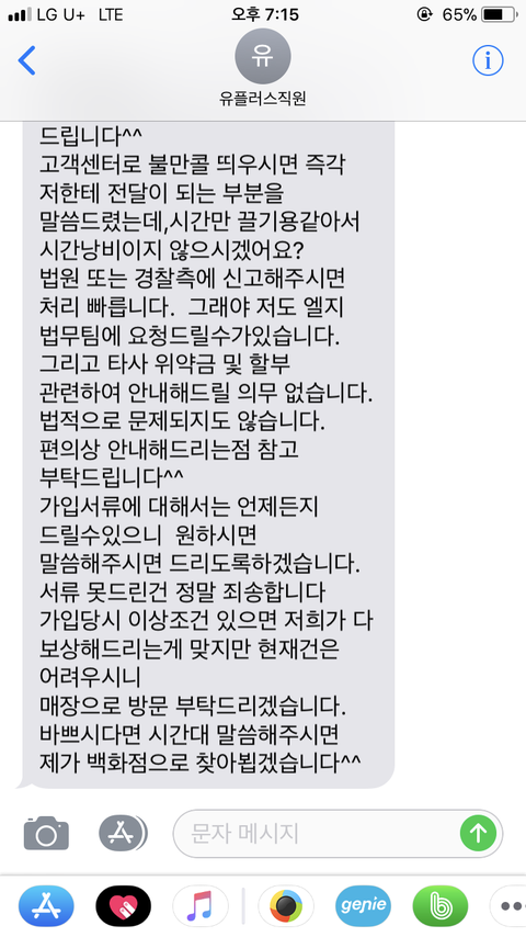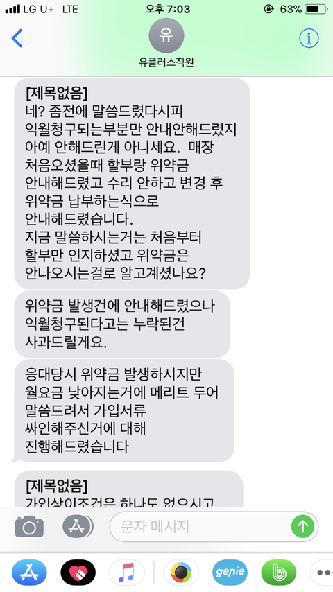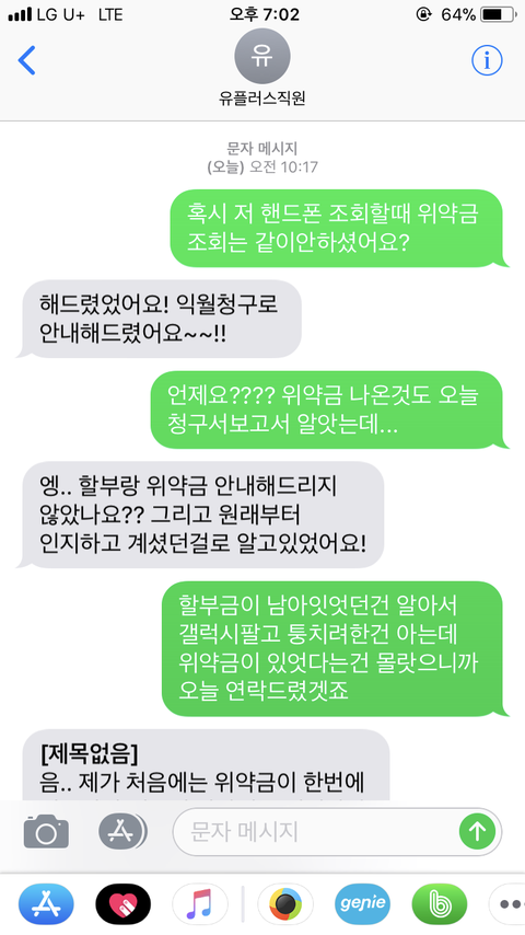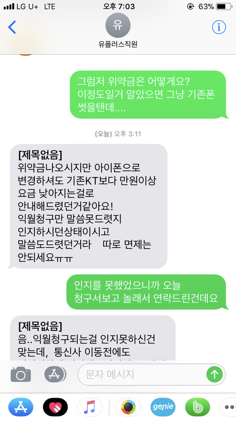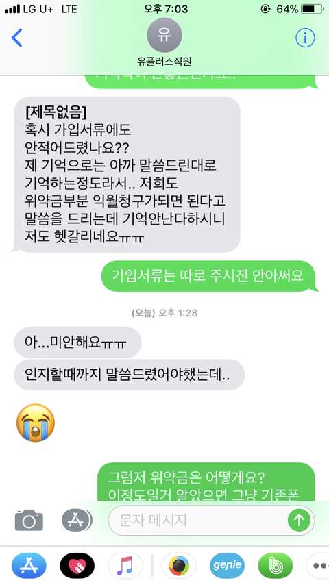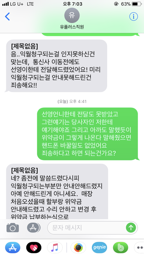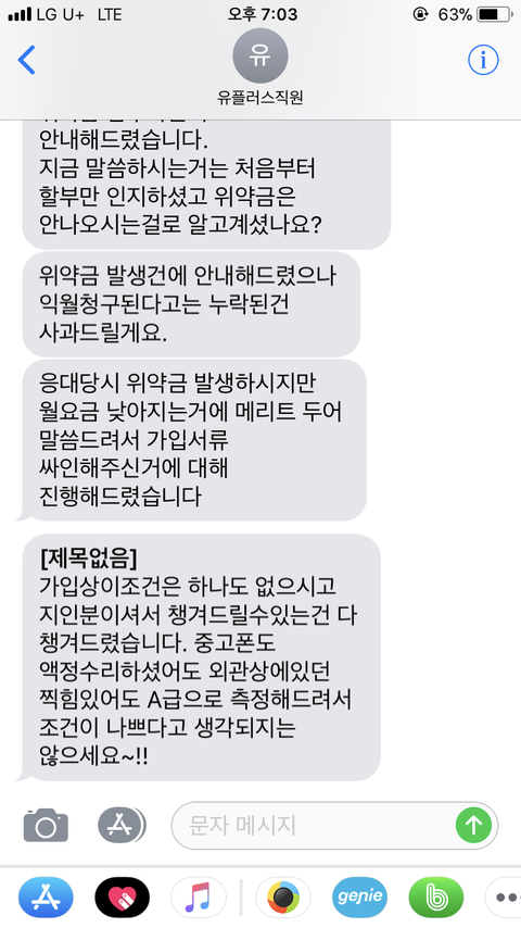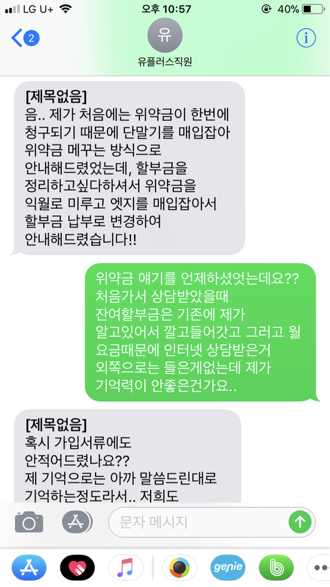 제가 핸드폰을 한달전에 개통했습니다.핸드폰을 바꾼건 너무좋습니다 이틀전만해도요 핸드폰을 원래 바꿀생각은없었지만 액정파손도됬고 할부기간도 얼마 남지않아 지인을통해 알아보기만 할까하고 지인아는대리점을 갔습니다.일을끝나고 간거라 밤9시쯤이였습니다.대리점직원은 할부금26만원정도남았고 갤럭시7엣지를사용했던 저에게 반납을조건으로15만원정도를 주겠다고하더군요 액정을고치고 반납을하면25만원에해주겠다고 안내를 했구요 저는 파손보험을들어논터라 액정고치고 반납하겠다고 말을했고 저녁이라 핸드폰개통은 내일아침에해주겠다며 서비스센터에 맡긴후 반납하면 그때 개통을해준다고하여 알았다고한후 새로산핸드폰을 개통안된채로 집에 귀가한후 다음날 서비스센터에가서 맡기고 대리점에 가져다줬습니다.25만원을받은후 할부금과 기존에쓰던 요금을 완납하고 이틀전에 지금쓰는핸드폰요금이나왔는데26만원이 빠져나갔더군요 알아보니 전에쓰던핸드폰 위약금이나온겁니다 저는 직원에게 위약금에대해 전혀 안내를받은적이없어 직원에게 연락을해보니 자기는 했다고 발뺌을하더군요 전 정말들은적도없었습니다.들었더라면 핸드폰을 구지 바꿀이유가없었습니다 대리점에가서도 30분을 고민끝에 결정한거면 말을 다한거죠 같이간 지인분도 그런안내는 전혀 들은바가없다고 얘길했구요 저는 너무답답해서 누구에게 말을해도 해결방안도없고 억울해 이판에다 글을씁니다.심지어 대리점직원은 저에게 계약서도 주지않았습니다.오늘통화해보니 자기가 바빠서 못줬다고말하는데 그게 말인가요 자기일처리 제대로 안할걸 저에게 말하는게 너무 웃기고 화가나네요 판님들 제발 조언부탁드려요..ㅠ밑에는 직원과 주고받은 내용올립니다.