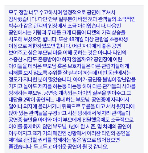 - 자녀에게 좋은 공연 보여주고 싶은 부모 마음 이해함, 그러나 이해하기엔 상황이 심각