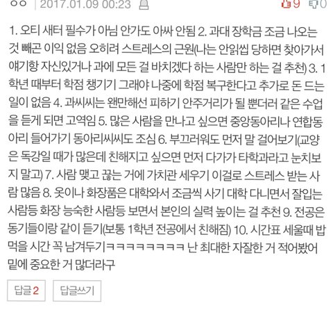이거 이외에도 옷이라든지 화장이라든지 연애라든 미팅 공부 등등 대학 생활 조언해주세요 ~