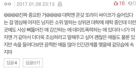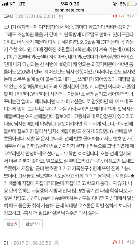 다른부분들은 글이나 댓글에서 다 적어줘서 쓸말은 없는데 생각나는거 하나적어봄 어쩌다 오티나 환영회에서 친해진 동기가 있는데 만약에 그 동기가 학교 잘 안나올것같다(걍 입학때부터 학교 맘에 안든다는둥, 결석자주하고 의지없어보이는 행동 등) 싶으면 최대한 빨리 버리셈. 친해진 친구가 걔밖에없으면 아싸로 다니거나 다른무리에 빠르게 끼거나 그건 자유. 이유 첫번째는 그런애랑 같이다니면 님들도 학교생활 비관적으로 되버리고, 원래는 반수생각없었는데 반수생각하게 되거나 똑같이 결석 자주해서 학점 망치는 결과 초래하는것도 있고, 두번째는 2학기때 개강해서 학교가면 그친구는 휴학하거나 자퇴하는 경우가 90%이상임. 즉 2학기때부턴 처음에 친해지느라 힘쏟은 친구하나 날라가는거