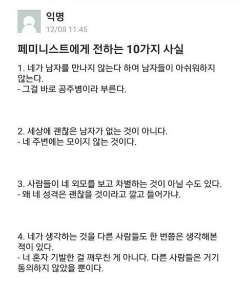 미리 말 할게ㅋㅋ 나 일베 안 하고 남초 안 하고 커뮤는 네이트판만 함 페북은 커뮤는 아니지만 하고ㅇㅇ 그리고 니들이 말 하는 그 '한남' 아니고 '흉자'아니고 '여혐' 아니야ㅎㅎ 너희와는 다르게 현실에서 페미 만났을 때 메갈끼보이고 한남한남거리면 연 끊을 자신 있어